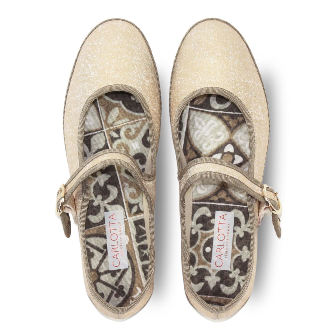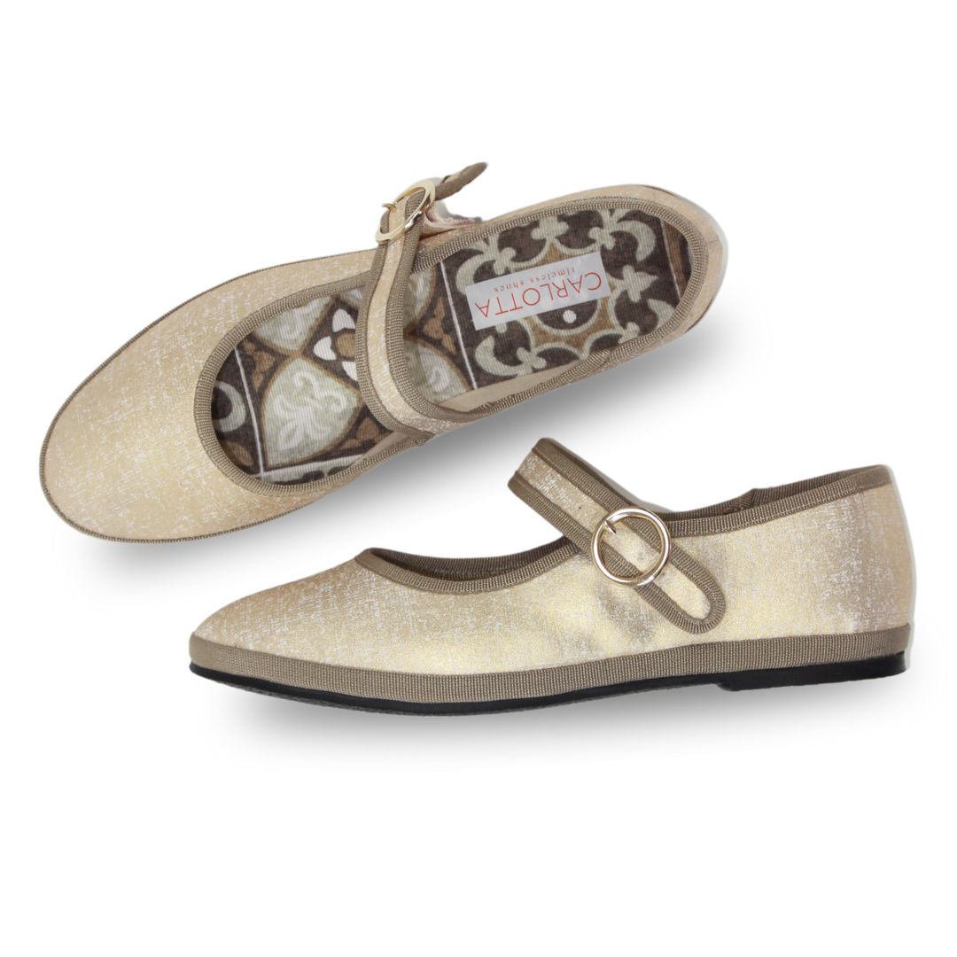¡Los zapatos Mary Jane son el must have de la temporada! Realizados con un elegante lino laminado en color oro, y un delicado ribete de algodón en color taupé, estos Mary Jane te harán lucir día y noche.