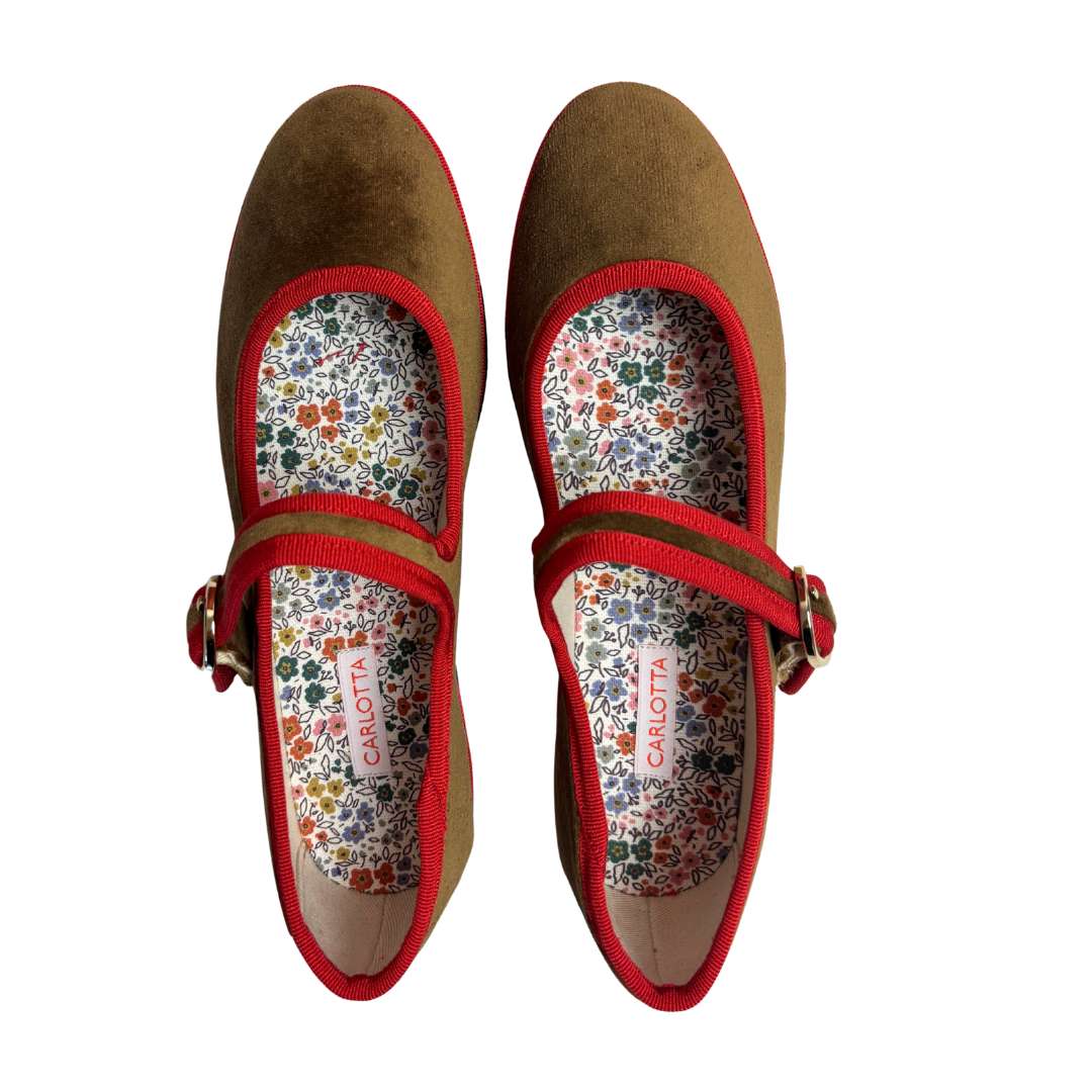 Nuestro Mary Jane en terciopelo rústico color Nut combina la delicadeza femenina con la textura rica y ligeramente mate del terciopelo, que aporta profundidad.