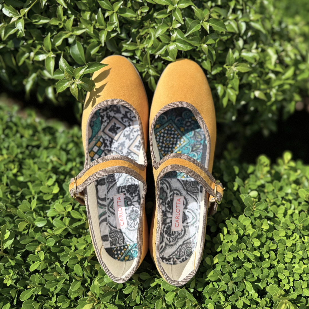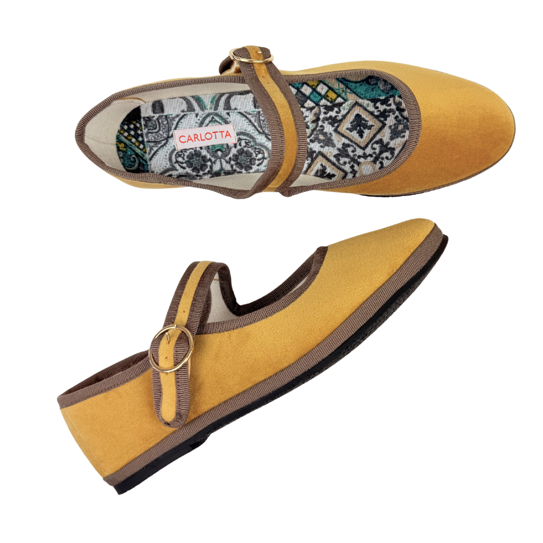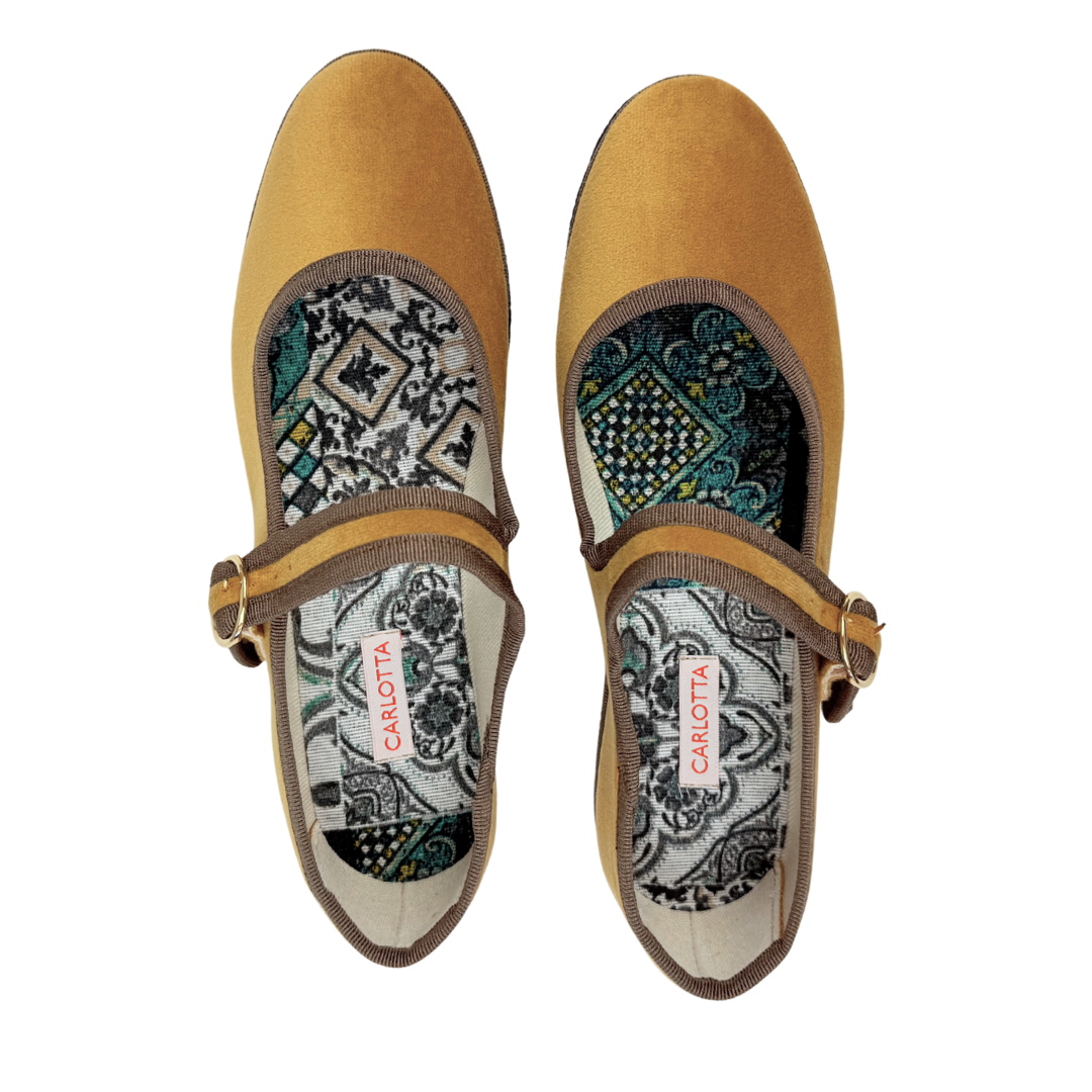 Estos Mary Jane en terciopelo color ocre son una opción ideal para tu día a día. Están confeccionados en material italiano de alta calidad con ribete en color taupé. Es una combinación que te permite combinarlo facilmente con cualquier outfit, principalmente para otoño e invierno.