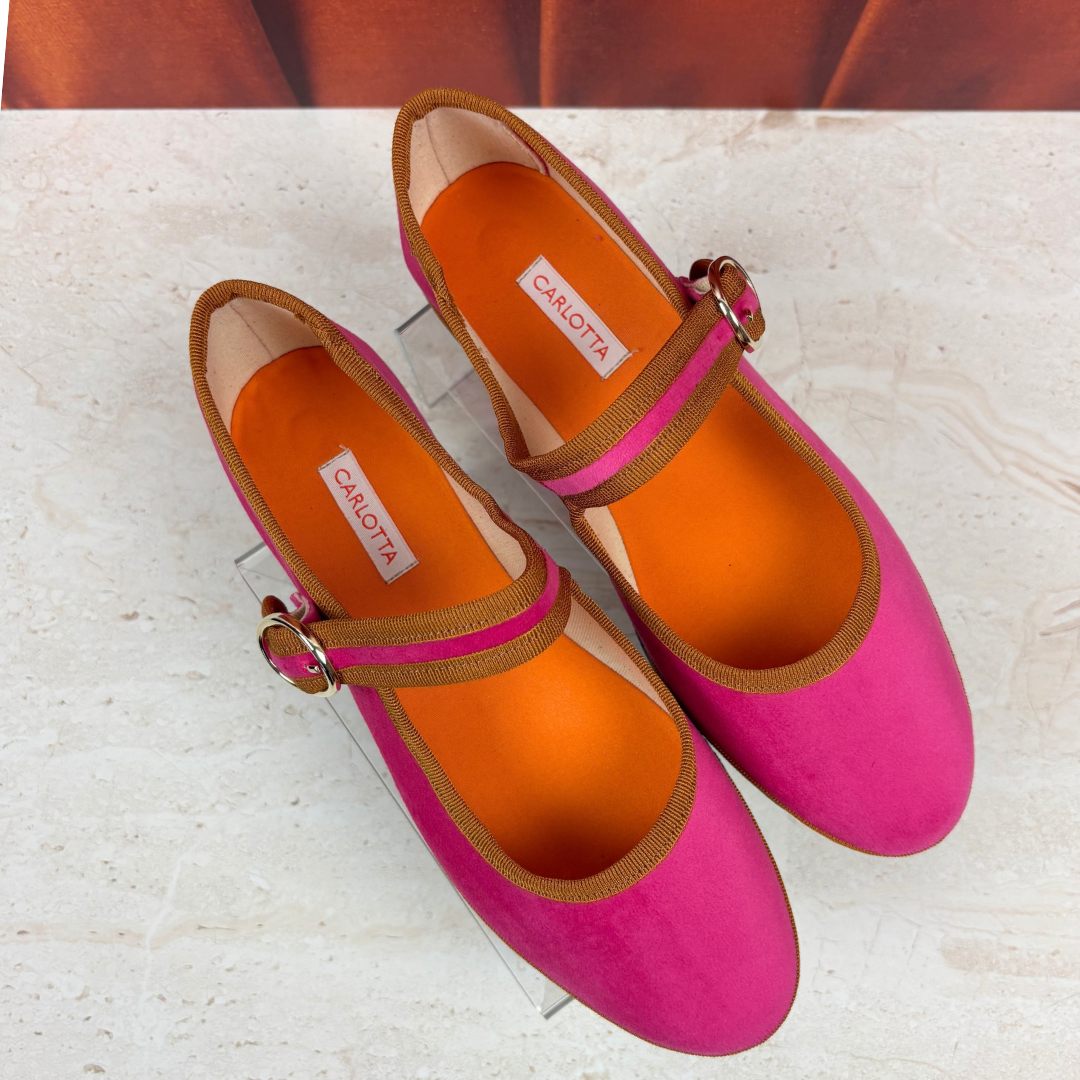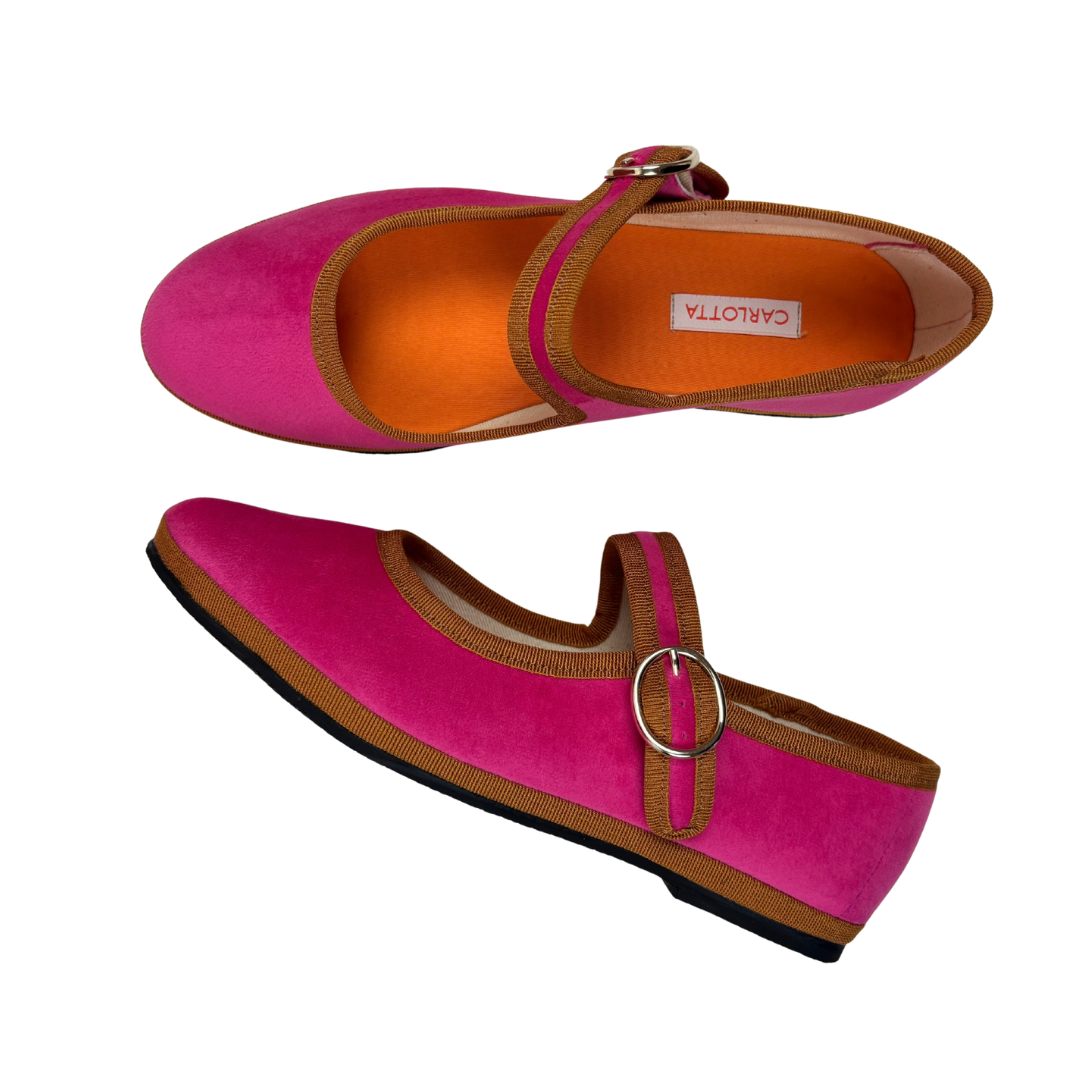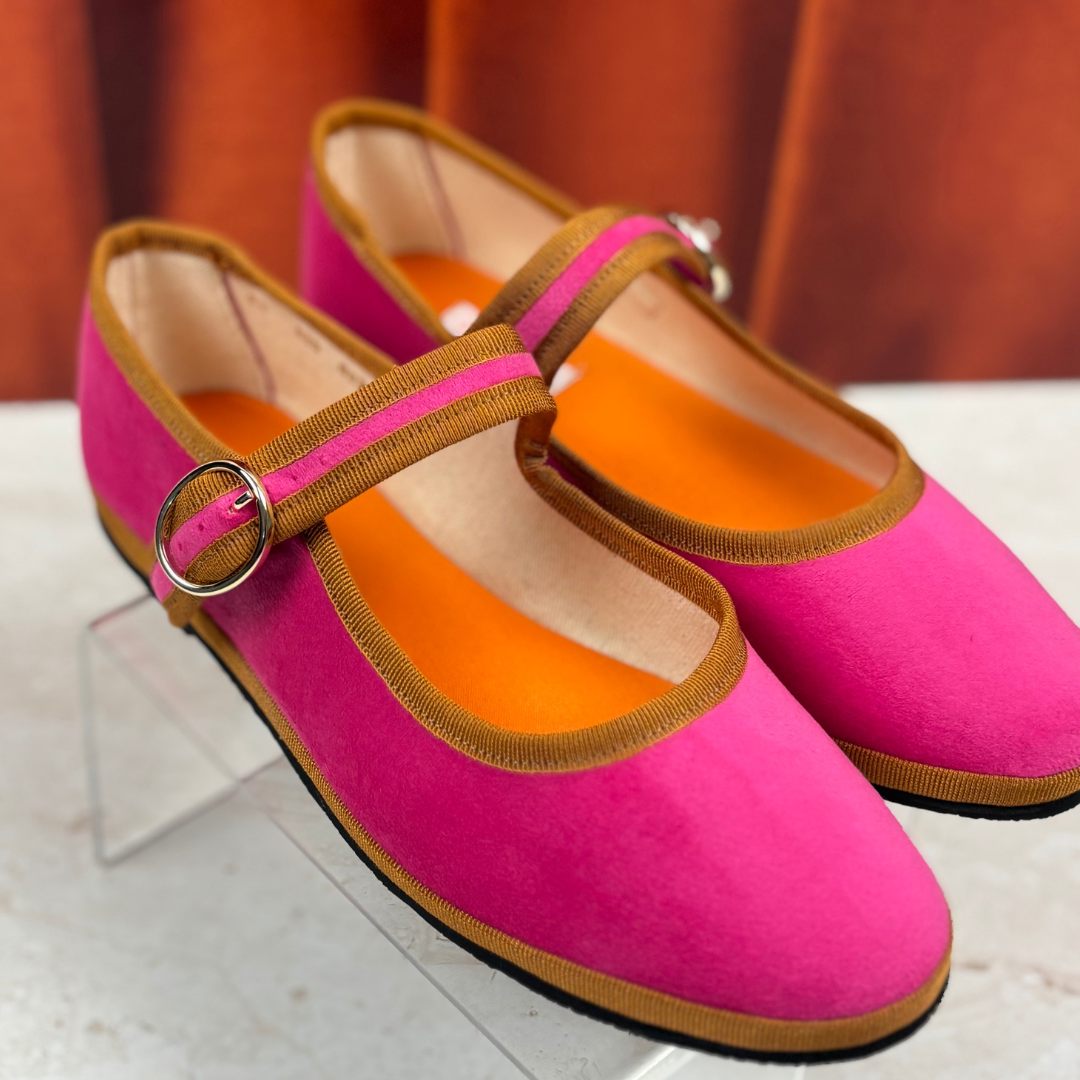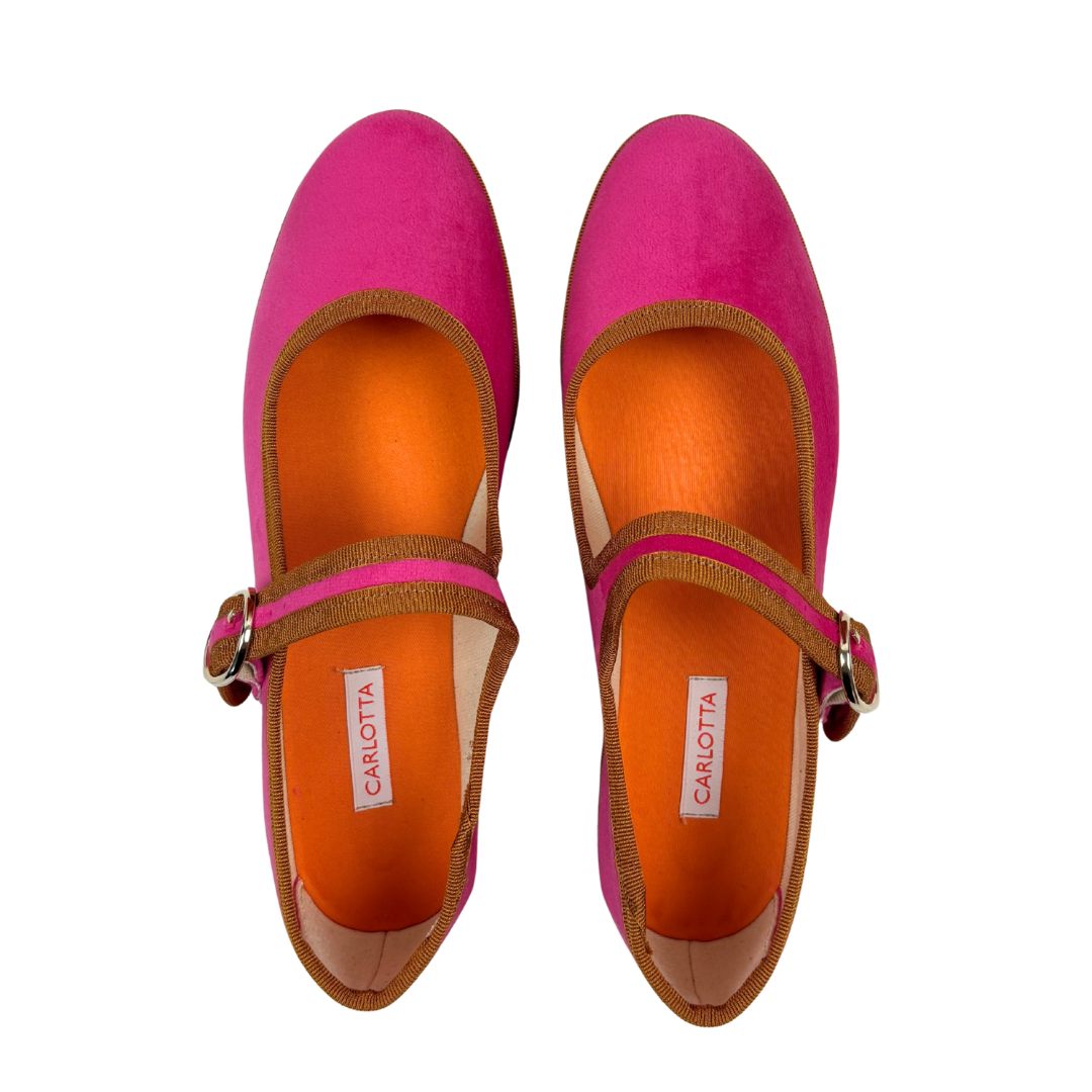 Sin duda los zapatos Mary Jane de terciopelo son un must have para un guardaropa sofisticado pero cómodo. El color rosa pitaya te da un estilo único y vibrante. Con su ribete en algodón y una hebilla dorada, estos zapatos aportan un toque importante de color.
